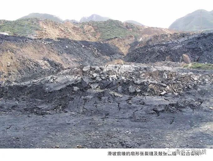 7 滑坡舌与滑坡鼓丘:滑坡体从滑坡剪出口滑出后伸入沟、堑、河道或台地上形似舌状的部分称为滑坡舌。国内也有称为滑坡头部(类似泥石流的龙头)的,由于滑动面反翘或滑坡体浅部受阻,该部分常形成垂直滑动方向的一条或数条土垄,称为滑坡鼓丘。8 滑坡台阶和滑坡平台:滑坡体在滑动中因上下各段的滑动次序和速度的差异,在其上部常形成一些错台,每一错台形成一个陡壁,此称为滑坡台阶。宽大的台面叫做滑坡平台,有时该平台具向山缓倾反向坡,叫做反坡平台,是滑坡的一个典型地貌特征,尤其是沿弧形面旋转滑动的滑动。9 滑坡后缘:主滑壁与山坡原地面的交线称为滑动后缘。10 滑坡前缘:滑坡舌前部与原地面线的交线叫做滑坡前缘,其最突出的地点叫舌尖。11 滑坡洼地和滑坡湖:滑坡滑动后,滑坡体与主滑壁之间拉开形成沟槽或陷落成“地堑”状,相邻土楔向山反倾形成四周高、中间低的洼地,称为滑坡洼地。当滑坡壁向外渗水或地表水汇集于洼地中形成渍泉地或水塘时,就成为滑坡湖。12 拉张裂缝与主裂缝:位于滑体上部因滑坡体下滑而张开的长达数十米至数百米、方向与滑坡壁吻合或大致平行的裂缝称为拉张裂缝,其中与主滑壁重合的一条称为主裂缝。13 剪切裂缝:位于滑坡中下部的两侧,因滑坡体与两侧不动体间发生剪切位移而形成的裂缝叫做剪切裂缝,它形成滑坡的两侧边界。14 羽状裂缝:滑坡体两侧剪切裂缝尚未贯通前,因动体与不动体间相对位移剪切形成的呈羽状(雁行状)排列的张裂缝称为羽状裂缝。15 鼓胀裂缝:滑坡体下部因下滑受阻挤压隆起形成垣垅(鼓丘),在其上形成垂直滑动方向的鼓胀裂缝。16 放射状(扇形)张裂缝:滑坡体下部因下滑受阻而形成的顺滑动方向的压张裂缝,在滑坡主轴部位大致平行滑动方向,两侧呈放射状(扇形)分布。在滑坡大滑动前,它先于鼓胀裂缝和滑坡剪出口出现,是抗滑段受压的标志。滑坡滑动后,滑体向两侧扩展也形成张裂缝,在舌部呈放射状分布,故称为放射状张裂缝或扇形张裂缝。