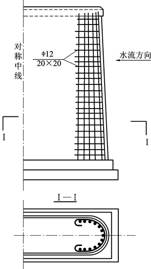 2、桥墩构造图 桥墩和桥台一样同属桥梁的下部结构,其作用是将相邻两孔的桥跨连接起来,如图11-10所示为该桥所用的轻型钢筋混凝土薄壁桥墩,该桥墩由墩帽及挡块、支座垫石、墩身、承台、桩基等组成。
