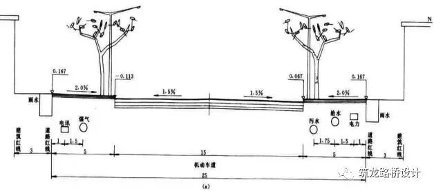 路侧带是位于城市道路行车道两侧的人行道、种植带、公用设施带等的统称。一般高于行车道0.08~0.2m,横坡采用直线型,向内侧倾斜,坡度为1~2%。