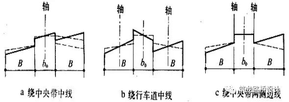 绕中间带的中心旋转:先将外侧行车道绕中间带的中线旋转,达到和内侧行车道构成单向横坡后,整个断面绕中线旋转,直至超高横坡。