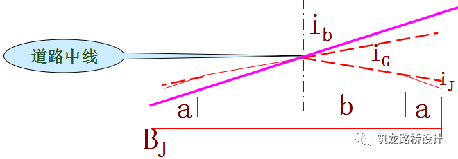 超高横坡等于道路路拱的横坡(在超高缓和段起点之前,将路肩的横坡逐渐变为路拱横坡,外侧车道绕路中线旋转,直到超高横坡)