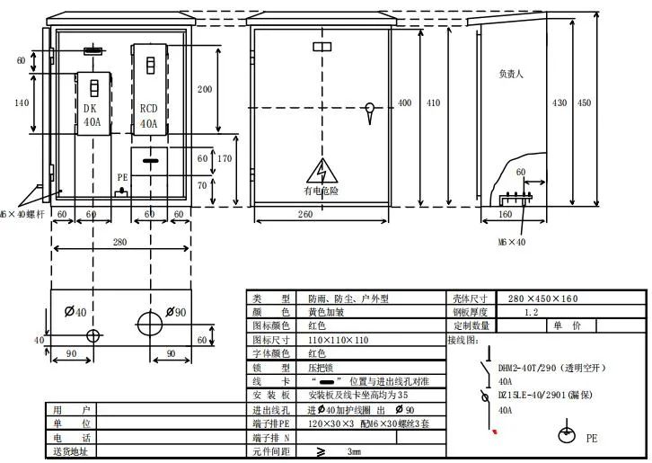 内设KDM1-T/2(20-40A)断路器,配置DZ15L-20-40/290漏电短路器,PE线螺栓为3个。