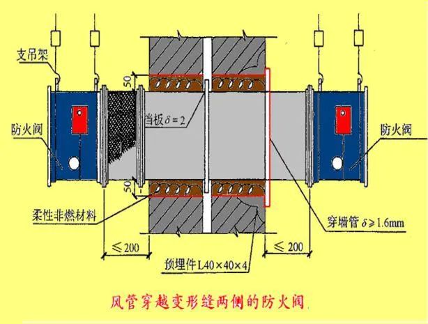 ③:风管穿越结构变形缝处应设置三防帆布柔性短管(消防风管采用防火帆布),其长度每边长出变形缝宽度100mm。负压风管要采用金属软接。