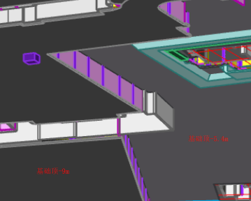 由于基础和基础以上构件需要拆分建模,基础上的柱、暗柱、剪力墙等竖向构件底标高就无法像常规项目自动找基础顶,而需要手工调整处理。为避免模型绘制上的偏差给后期合并模型带来影响,将基础以上竖向构件底标高调整为绝对标高,如-9.05,而不使用相对标高,如基础顶标高。如果基础为阶梯式,其上的墙体则需要分段绘制,分别调整标高。