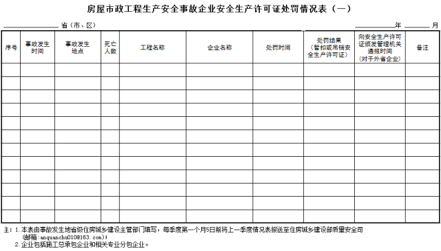 附件:1.房屋市政工程生产安全事故企业安全生产许可证处罚情况表(一)、(二)