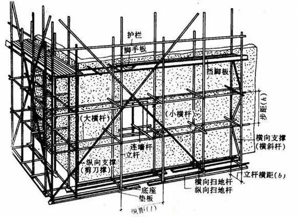 脚手架:施工现场为工人操作并解决垂直和水平运输而搭设的各种支架。
